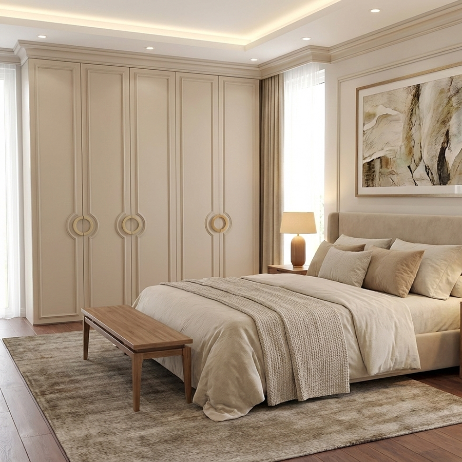 Каркас из ЛДСП "Эггер", цвет - "Бежевый песок U156 ST9". Двери МДФ в эмале толщина 22мм.