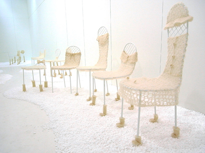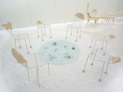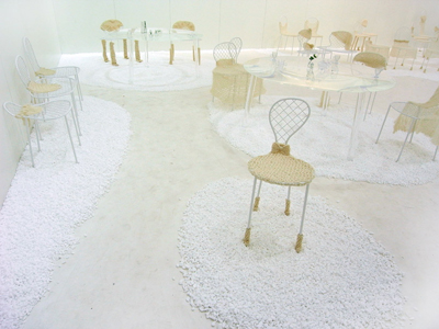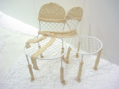 На мизансцене под руководством автора были установлены стол «Капля стол» («Drop table»), «Сад тарелка» («Garden plate») и стулья с изумительными, мягкими, непохожими одна на другую вязанными спинками «Семейные стулья» («Family chairs»), поставленные так, будто близкие люди общаются друг с другом. Все предметы мебели были изготовлены итальянской компанией «Living Divani».