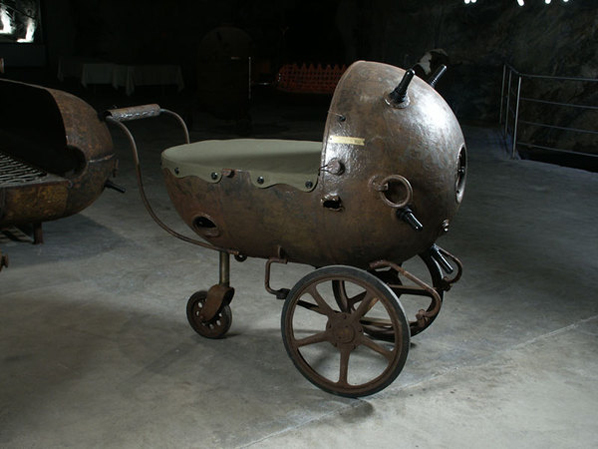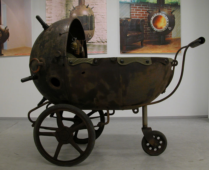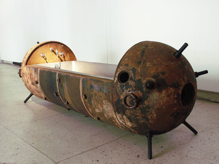 Эстонский дизайнер Мати Кармин (Mati Karmin) нашел отличное и вполне мирное применение пустым морским минам времен СССР. Он начал превращать мины в оригинальные и необычные декоративные предметы мебели: кресла, кровати, диваны, стойки, камины, унитазы и даже детские коляски.