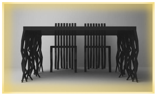 Александр Моторный, автор коллекции, создал стол и стулья, будто вросшие могучими, причудливо переплетенными корнями в землю. Причем весь кухонный гарнитур создан из легкого пластика, который с первого взгляда вряд ли получится отличить от дерева.