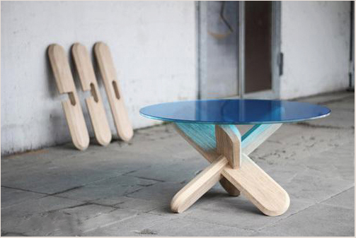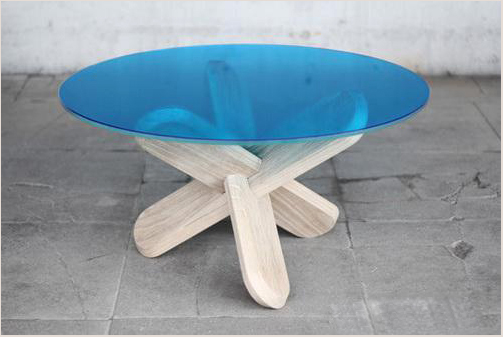У этого стола имеется три ножки из необработанной древесины дуба, которые скрепляются друг с другом при помощи специально прорезанных в них отверстий. Ножки создают надежную опору друг для друга, превращаясь в настоящий деревянный узел. А сверху на них устанавливается прочная круглая столешница из синего матового стекла.
