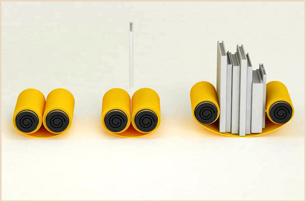 Полка «Scroll Bookshelf» в свернутом виде напоминает пергаментный свиток. Только вместо пергамента в рулон свернут тонкий лист металла, покрытый приятным на ощупь слоем пластика. Разворачивая этот свиток, между его рулонами можно размещать книги, которые и будут поддерживаться с обеих сторон своеобразным книгодержателем. Размеры полки при этом, естественно, могут плавно варьироваться в зависимости от поставленного на нее количества книг. Кроме того, в боковых ручках полки вмонтированы выдвижные пеналы для хранения канцелярии.