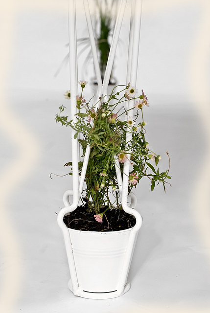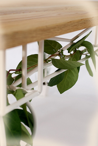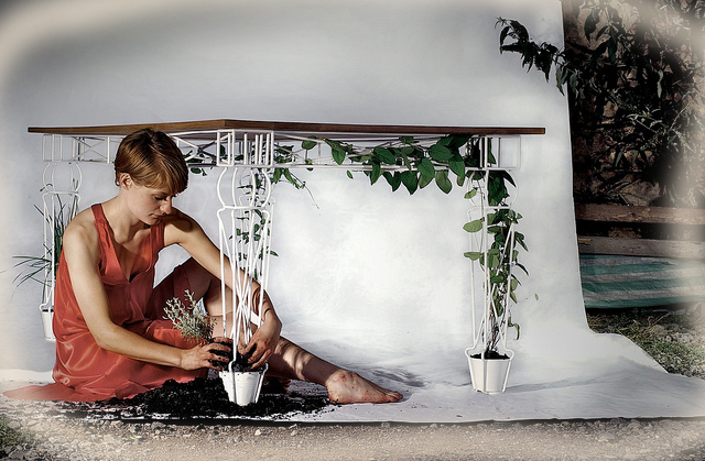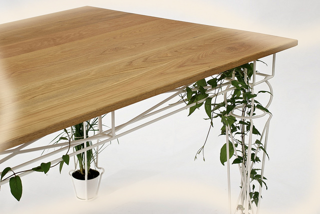 Каждая ножка чудесного экологичного стола одновременно является подставкой для горшка, наполненного землёй, опорой для столешницы и поддержкой для развития посаженных в горшки растений. Дизайнеры считают, что наиболее удачно в таких горшках будут выглядеть вьющиеся цветы, душистый горошек, помидоры, виноград.