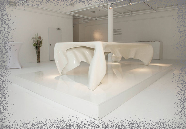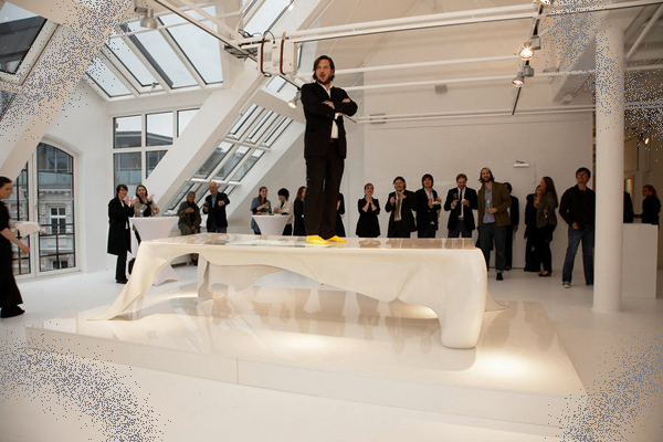 У стола-скатерти нет структурной поддержки, он самодостаточен. Обманчивая лёгкость и кажущаяся непрочность - лишь фантом. Изменчивый, призрачный, ускользающий. Стол-фантом выполнен из высокопрочного современного материала - композитного стекловолокна, толщина которого всего 6 мм.