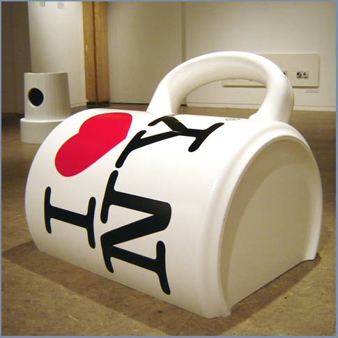 Он также представил несколько арт-объектов, представляющих собой сильно увеличенную битую посуду. Вся мебель украшена принтами и выглядит довольно интересно.