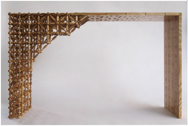 Внешне мебель представляет собой фантасмагорическое смешение текстур. Стол создан в восточном стиле. За основу дизайнеры взяли вид традиционного восточного окна машрабия.