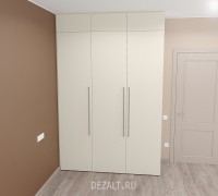 С левой стороны нам пришлось сделать отступ от стены и закрыть щель планкой-добором. Если б мы этого не сделали, левая дверь не смогла бы полностью открываться, мешался бы плинтус внизу, либо, нам пришлось бы делать высокий цоколь у шкаф и уменьшать двери по высоте. Заказчики решили что этот вариант, как мы сделали, будет лучше.