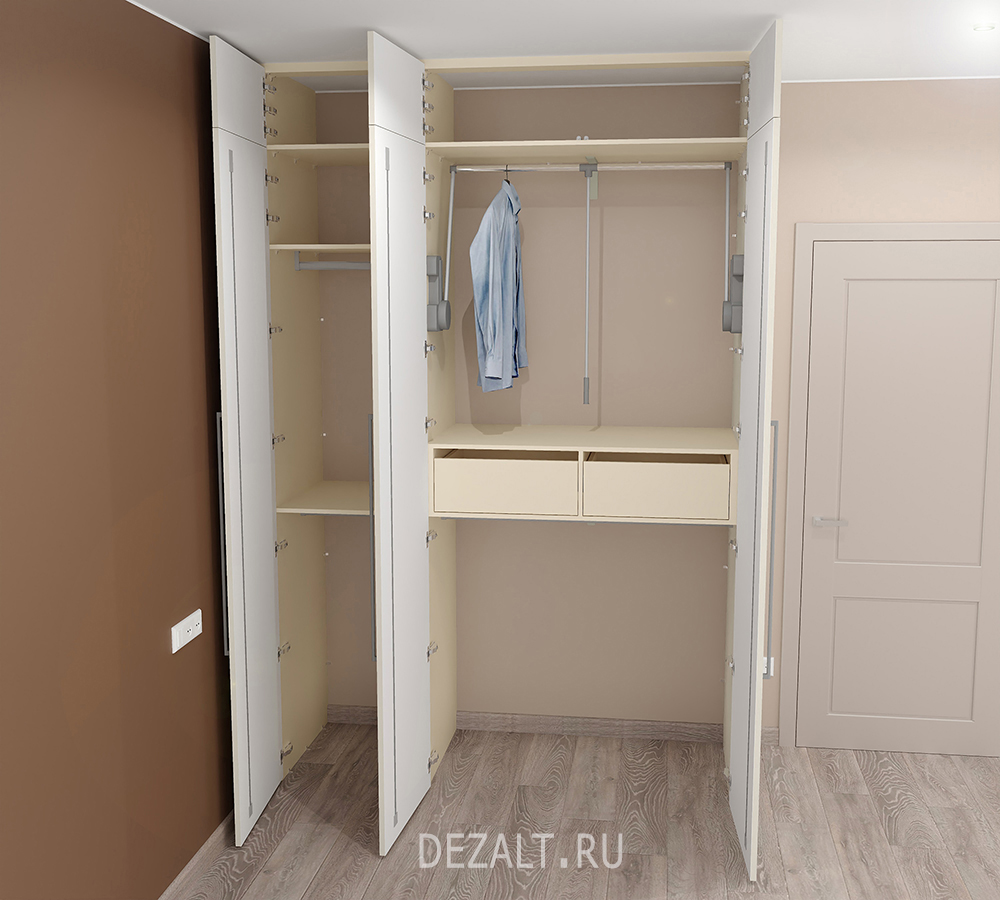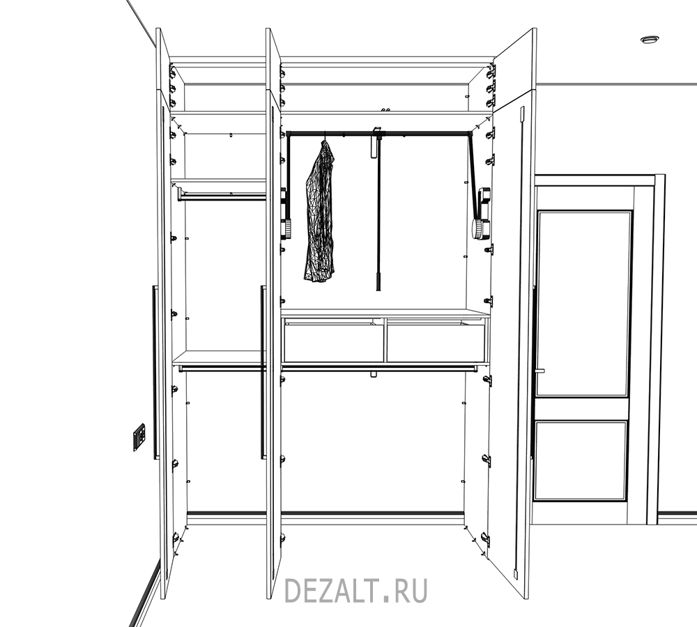 По конструкции шкаф был достаточно простой. Ольга попросила сделать 3 штанги для коротких вещей, поставить один пантограф и сделать два выдвижных ящика для нижнего белья на уровне груди.