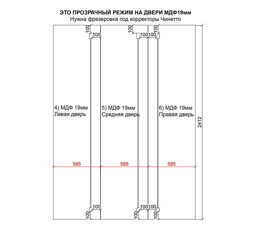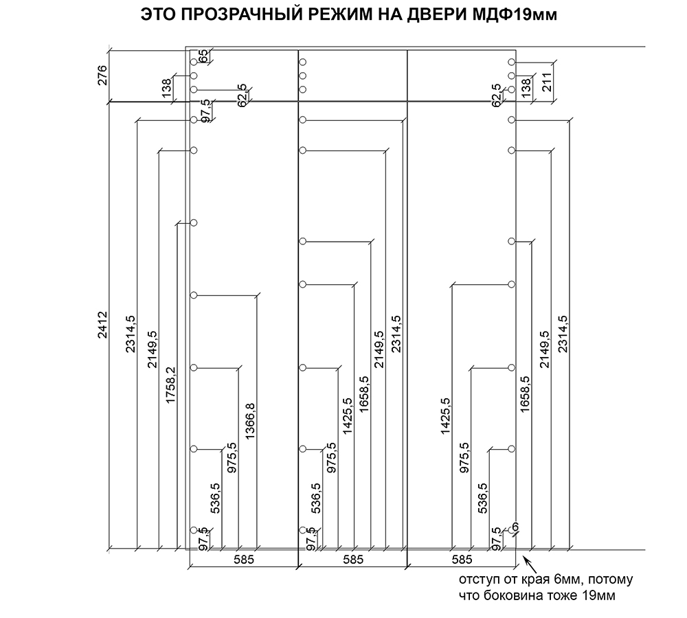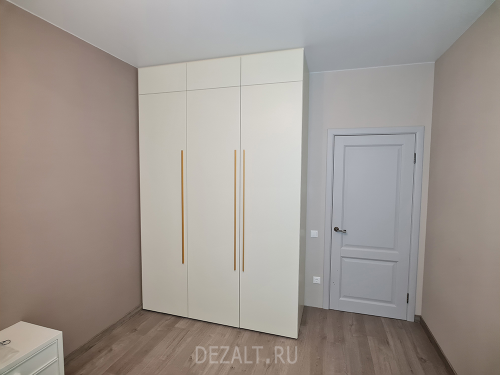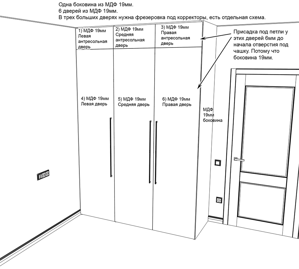 С левой стороны нам пришлось сделать отступ от стены и закрыть щель планкой-добором. Если б мы этого не сделали, левая дверь не смогла бы полностью открываться, мешался бы плинтус внизу, либо, нам пришлось бы делать высокий цоколь у шкаф и уменьшать двери по высоте. Заказчики решили что этот вариант, как мы сделали, будет лучше.