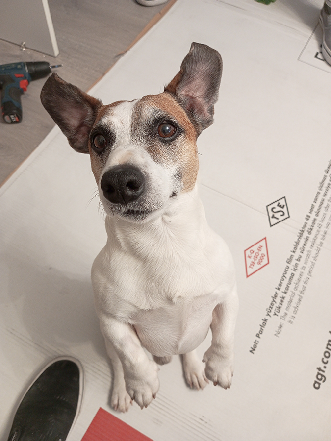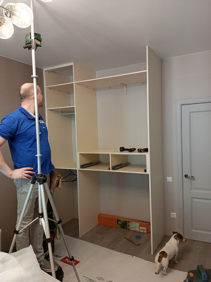 Пока не было дверей и боковины, семья пользовалась шкафом. Когда мы привезли детали МДФ для установки, вещи из шкафа они убрали.
