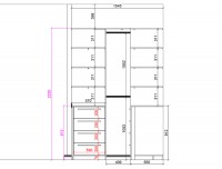 Мы предложили разместить справа колонку с полками и выдвижными ящиками, а остальное пространство занять антресолями и штангами. Однако заказчик пожелал увеличить количество ящиков и полочек. В связи с этим мы добавили ещё одну колонку напротив входной двери. В углу разместили несколько штанг.