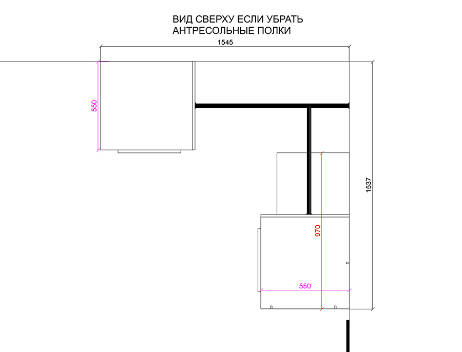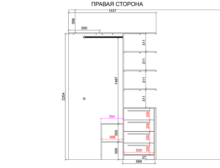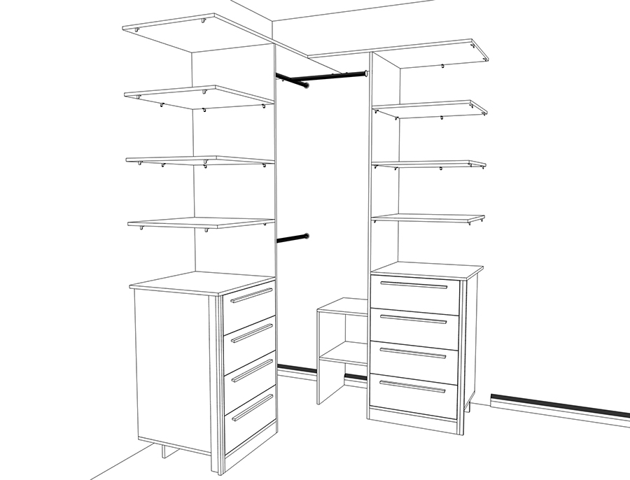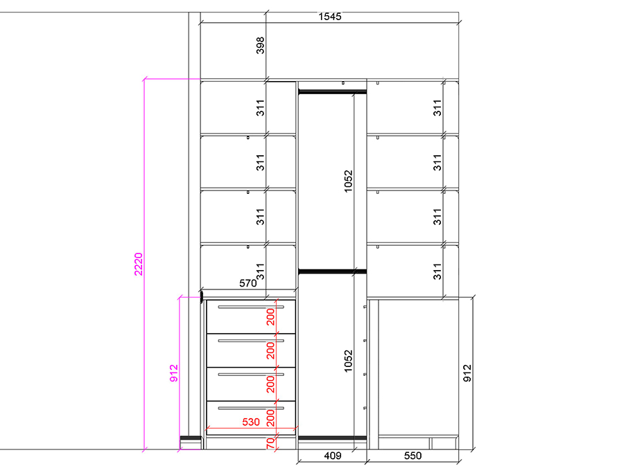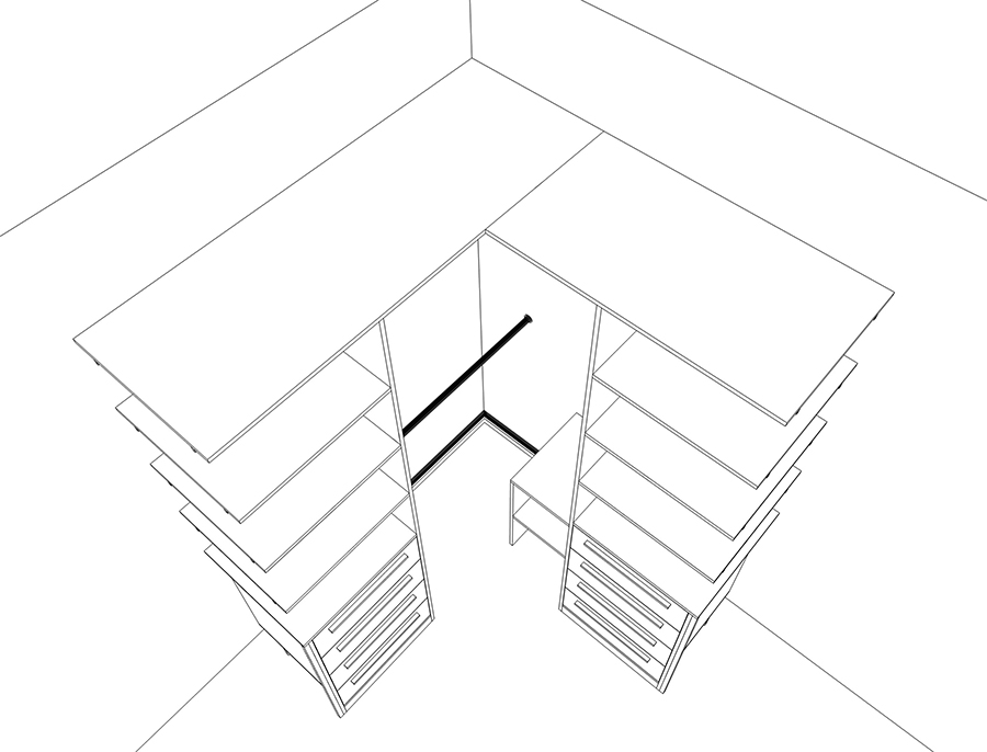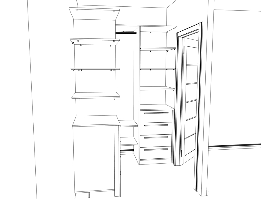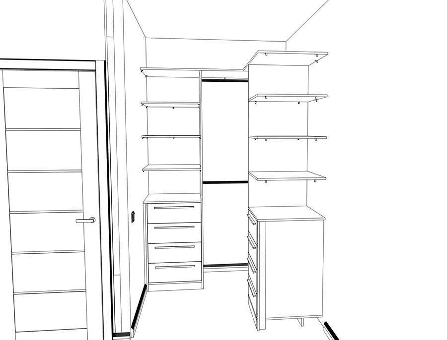 Мы предложили разместить справа колонку с полками и выдвижными ящиками, а остальное пространство занять антресолями и штангами. Однако заказчик пожелал увеличить количество ящиков и полочек. В связи с этим мы добавили ещё одну колонку напротив входной двери. В углу разместили несколько штанг.