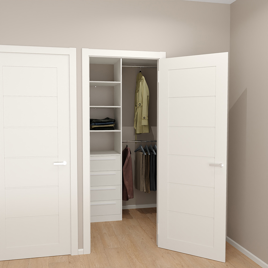 Размеры помещения для хранения одежды — 1,5 на 1,5 метра. Входная дверь расположена слева, поэтому оптимальным решением стала Г-образная конструкция.