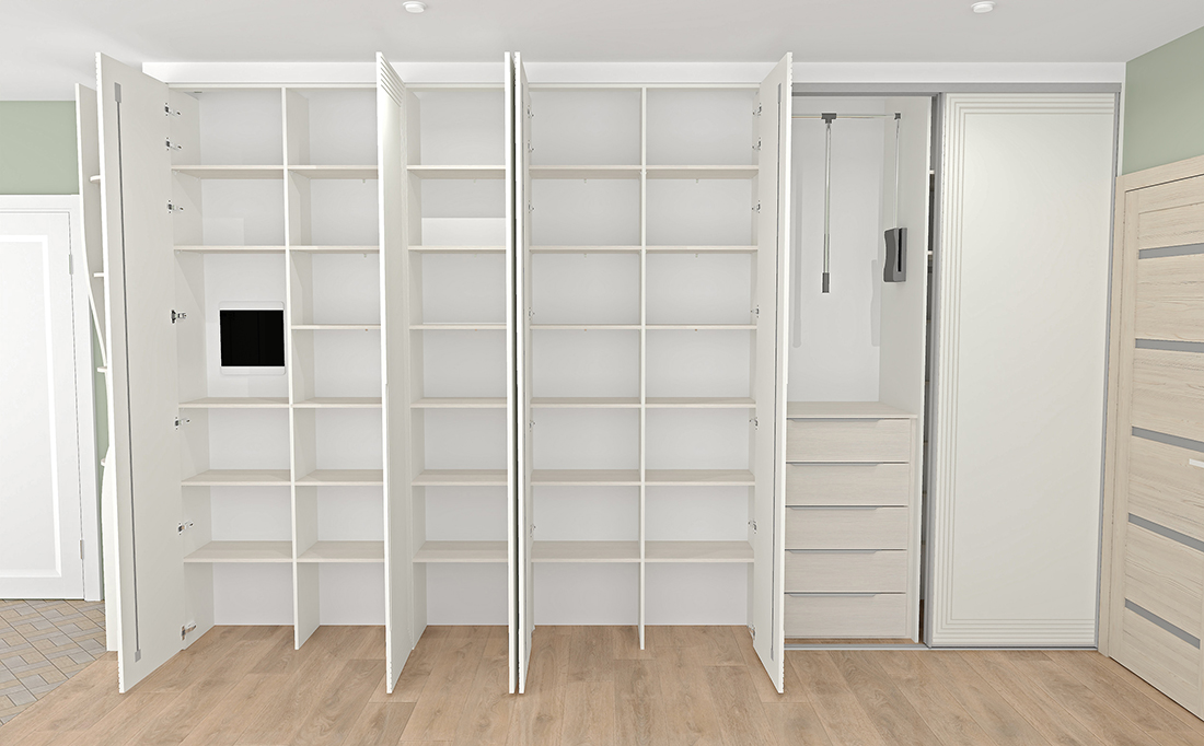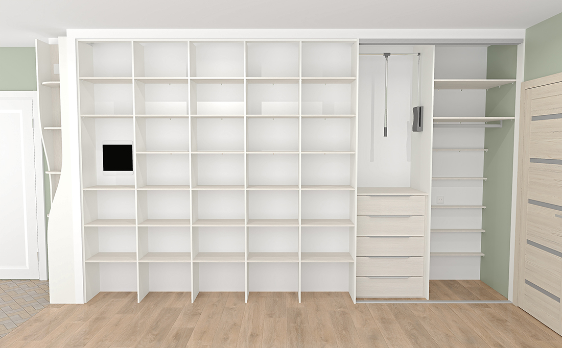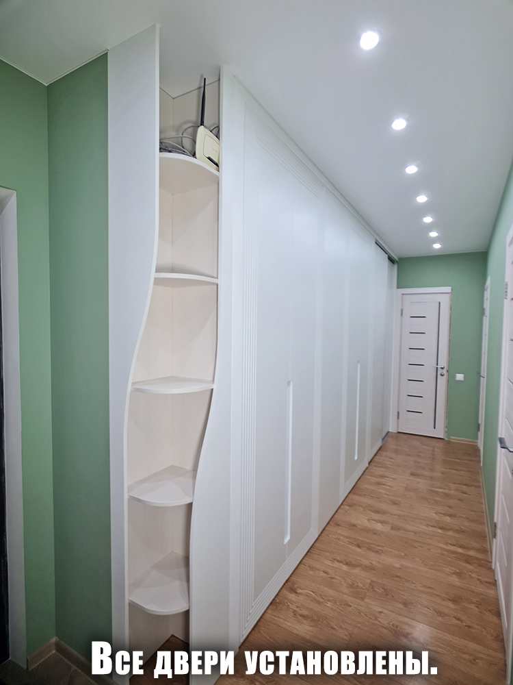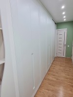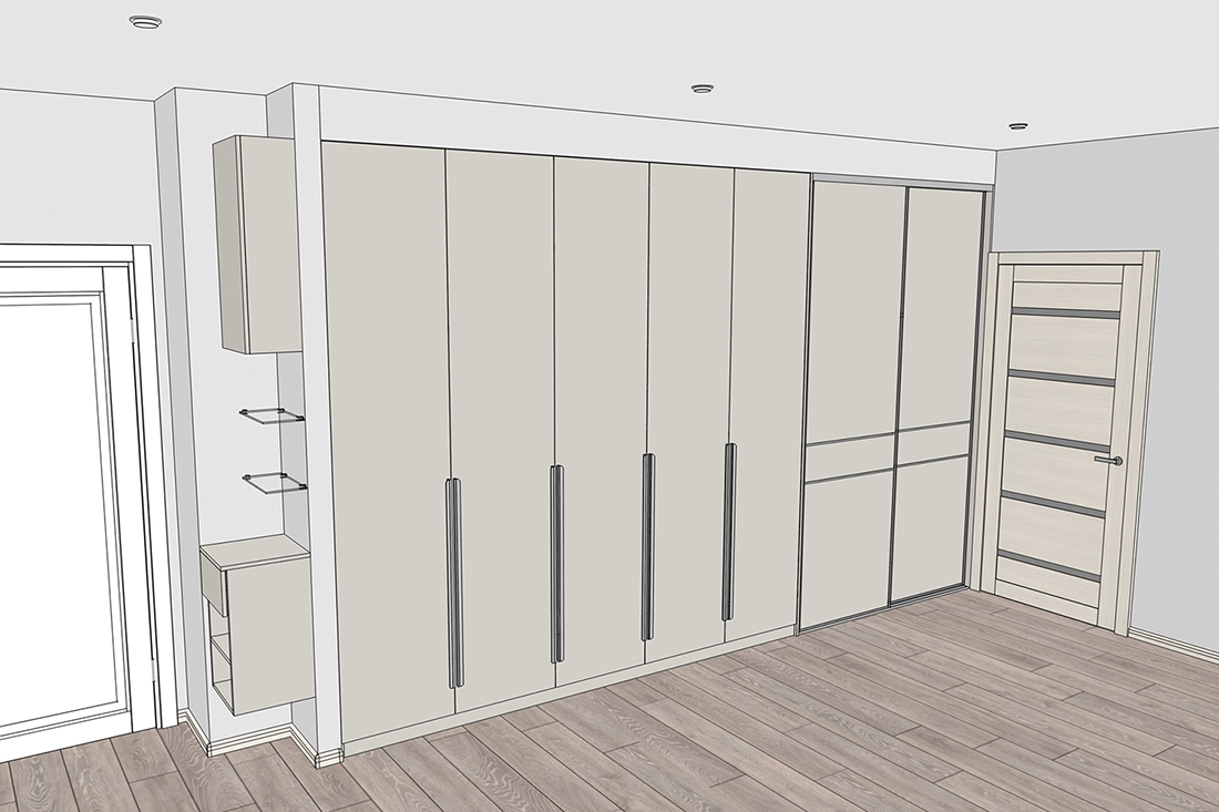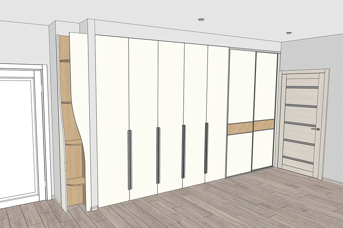 Ирине нужен был шкаф в длинный коридор, и она обратилась к нам за проектом. Семья состоит из четырёх человек, поэтому требовалось уместить много вещей.