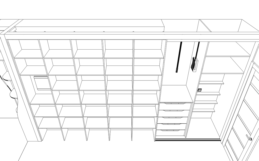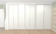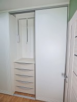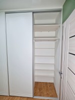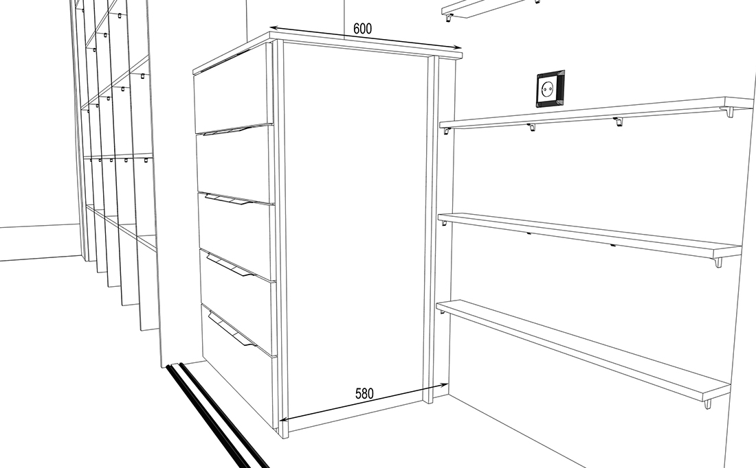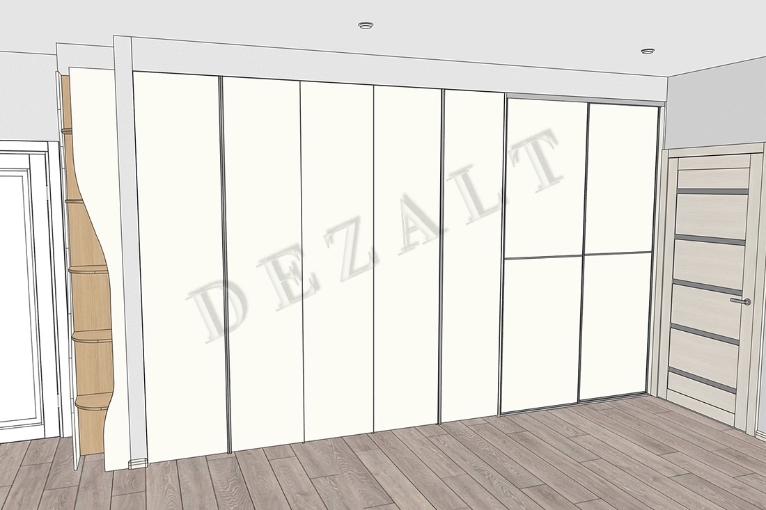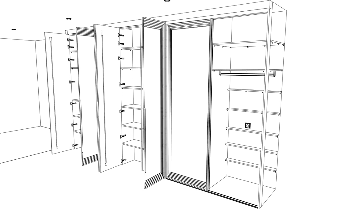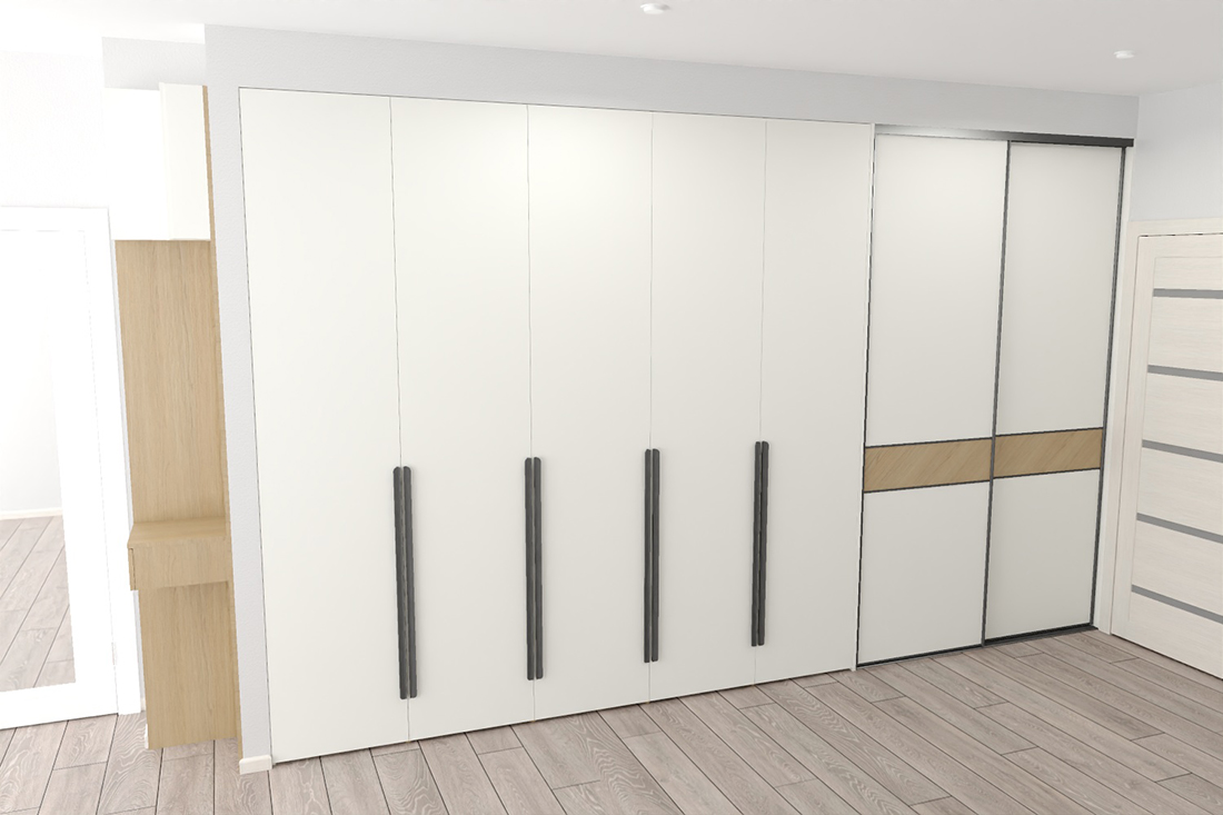 Ирине нужен был шкаф в длинный коридор, и она обратилась к нам за проектом. Семья состоит из четырёх человек, поэтому требовалось уместить много вещей.