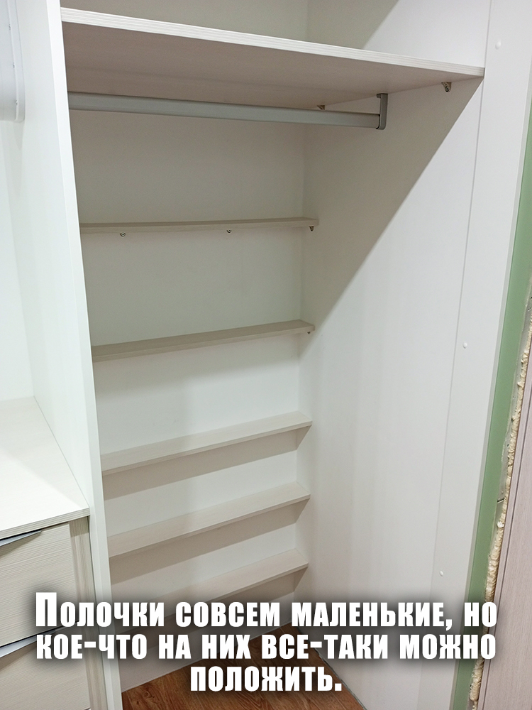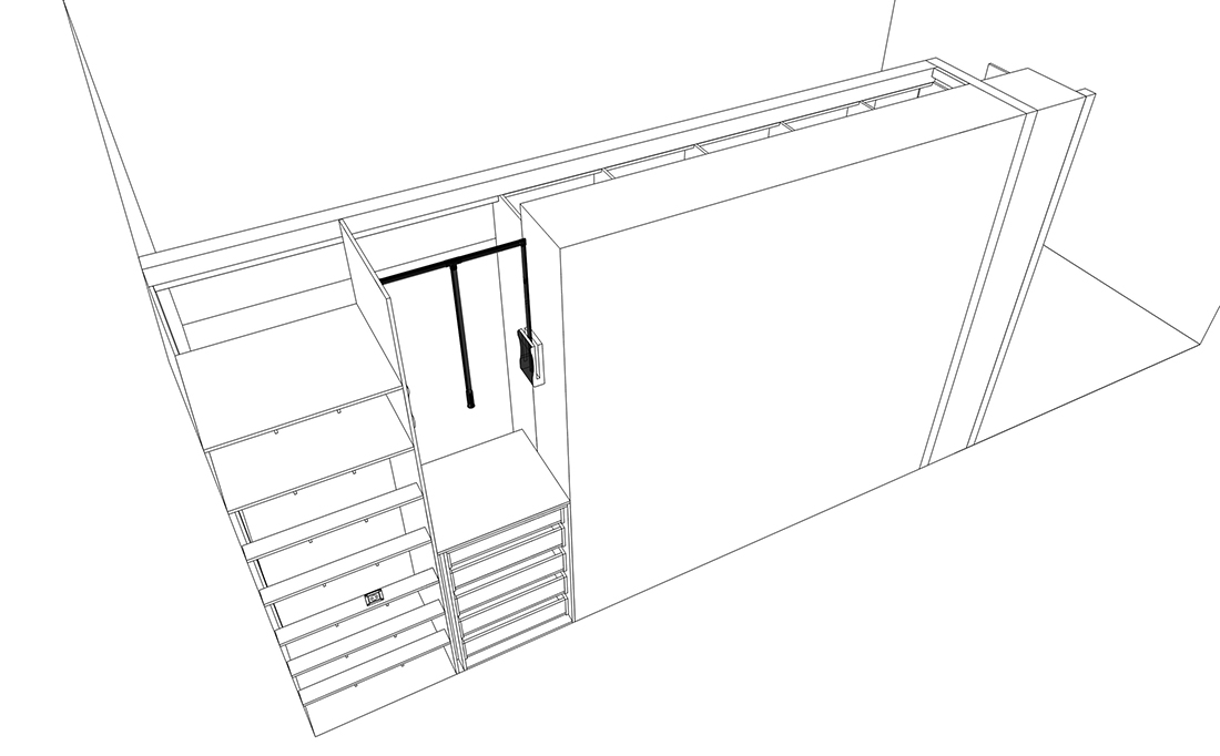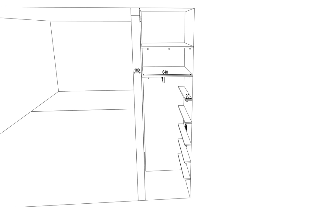 Простенки в коридоре оказались разной глубины, поэтому шкаф получился двухуровневым, с разными типами дверей. Там, где глубина 340 мм, запланировали распашные двери. Там, где 744 мм, — двери‑купе. Учли, что двери‑купе «съедают» 100 мм полезной глубины: внутри останется 640 мм для полок и одежды на плечиках.