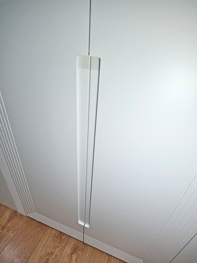 Помимо декоративной фрезеровки, выполнили техническую — с внутренней стороны каждой двери. В неё вставили корректоры против изгиба. МДФ при длине более двух метров склонен изгибаться, а для дверей это критично: возникает ощущение, что фасад шкафа кривой. Корректоры выравнивают дверь, делая её идеально ровной.