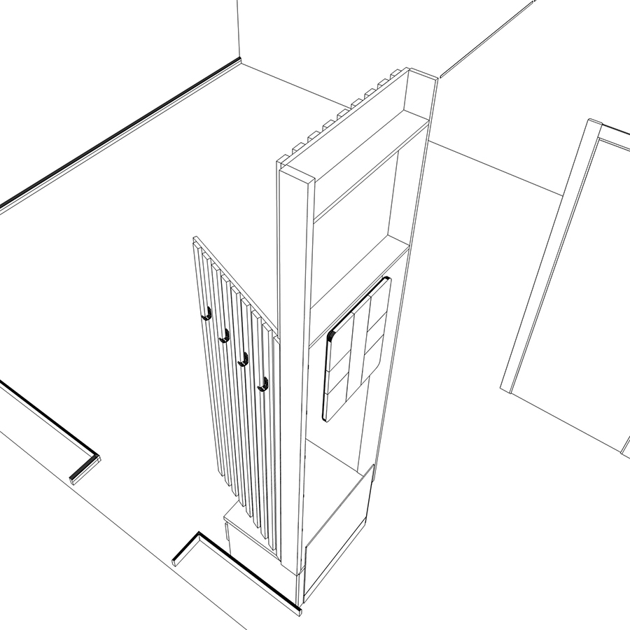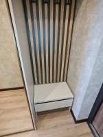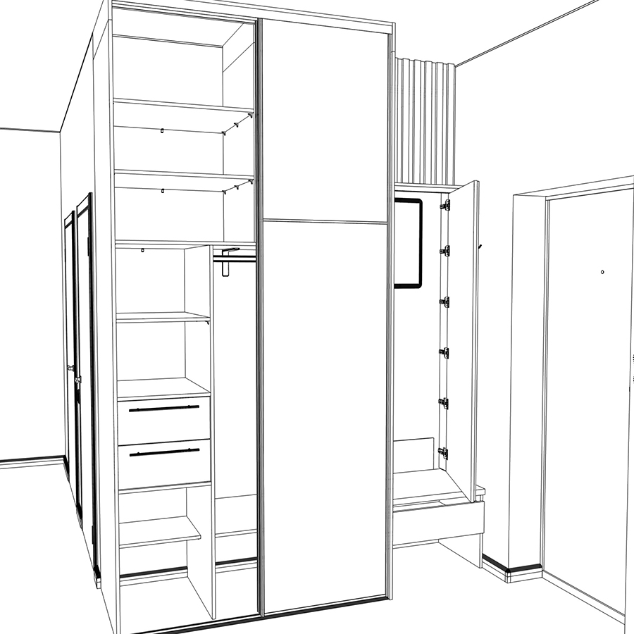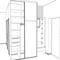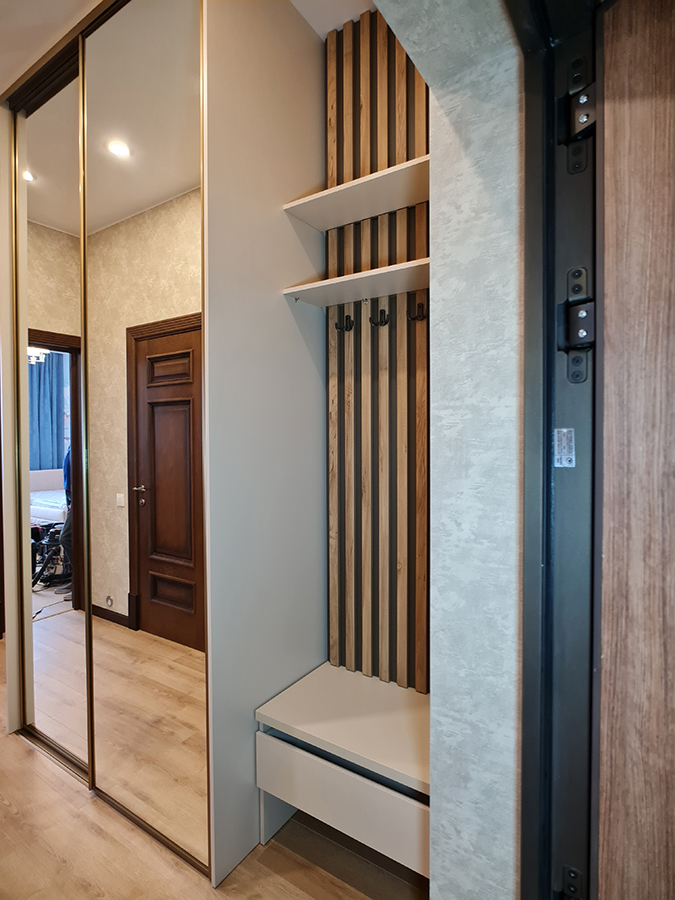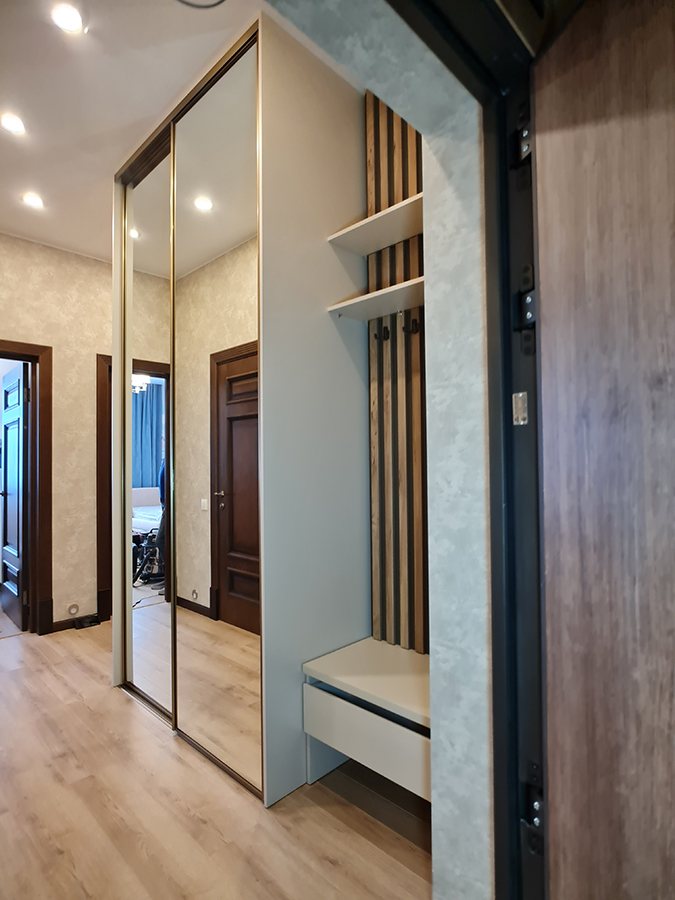 В прихожую требовался вместительный шкаф для хранения верхней одежды на всю семью. Было решено делать встроенный высокий шкаф-купе, так как классические распашные двери в этом узком месте занимали бы слишком много пространства.