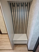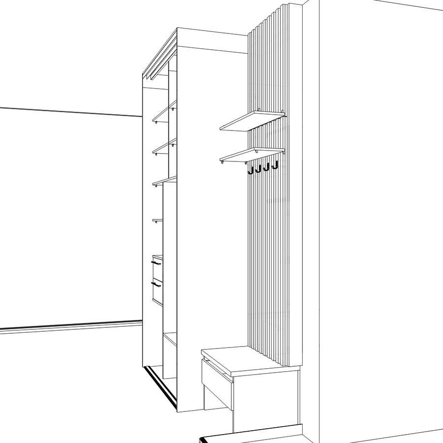 Внутри я предусмотрели блок выдвижных ящиков для мелочей: ключи, перчатки, туалетная вода, щетки для обуви, шарфы. Считаю, что в прихожей такие ящики обязательны — это очень удобно. Конечно, есть и классика: штанга для вешалок, полки для одежды и обуви.
