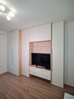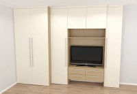 Чтобы шкаф не выглядел тяжеловесным, мы скомбинировали древесный декор корпуса с белыми фасадами. Это освежило интерьер и «разбавило» бежевые тона комнаты. Ручки выбрали одной серии, но разной длины — так они гармоничнее смотрятся на дверях разного размера. Для подключения техники все розетки были вынесены со стены прямо на заднюю панель из ЛДСП.