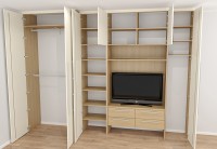 Главная особенность этого проекта — каскадное расположение секций. Мы не стали делать шкаф одной глубины, а разбили его на три зоны: